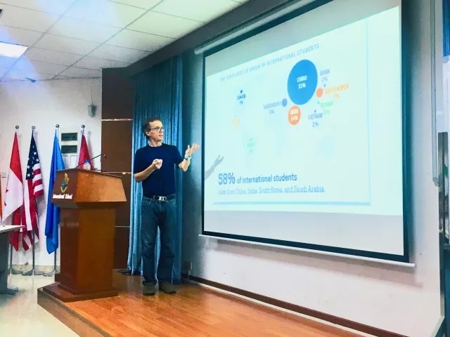 下午,Barry教授为在场领导老师和同学做了美国高等教育现状的讲座。